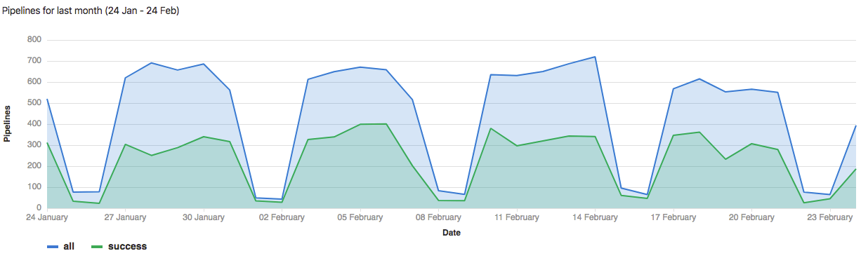 GitLab tracks the history of your pipeline successes and failures, as well as how long each pipeline ran. To view this information, go to Analytics > CI/CD Analytics.