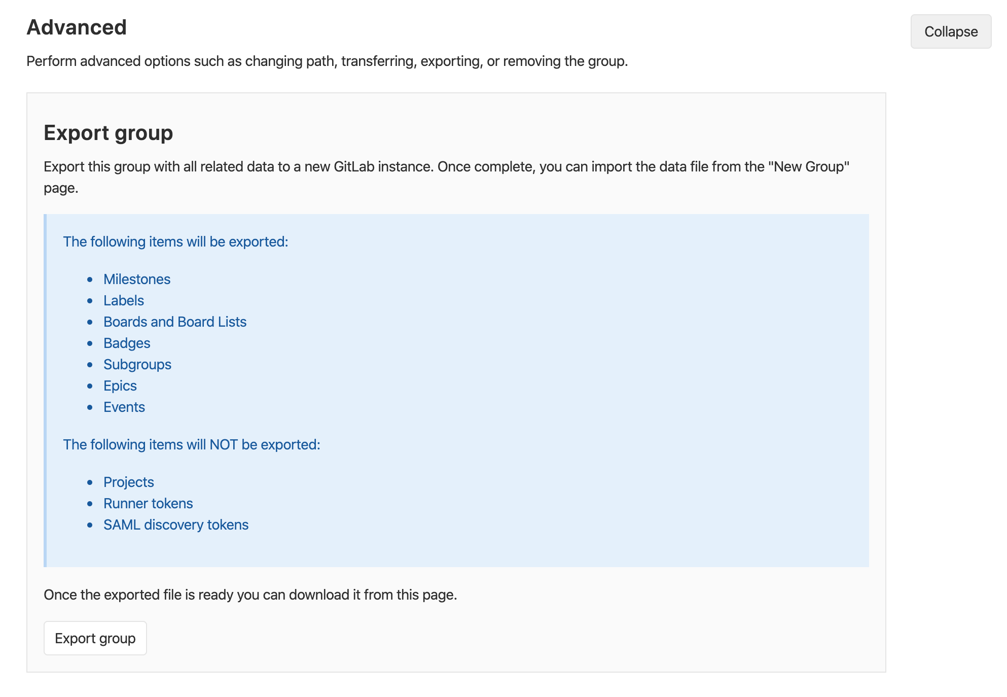 Existing groups running on any GitLab instance or GitLab.com can be exported with all their related data and moved to a new GitLab instance.