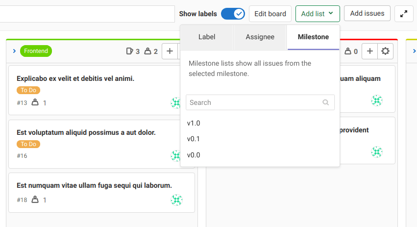 If the To Do and Doing labels don't exist in the project or group, they are created, and their lists appear as empty. If any of them already exists, the list is filled with the issues that have that label.