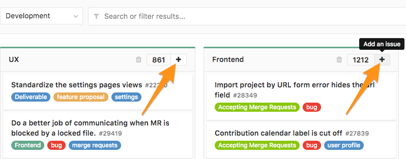 From an Issue Board, create a new issue by clicking on the plus sign (+) at the top of a list. It opens a new issue for that project, pre-labeled with its respective list.